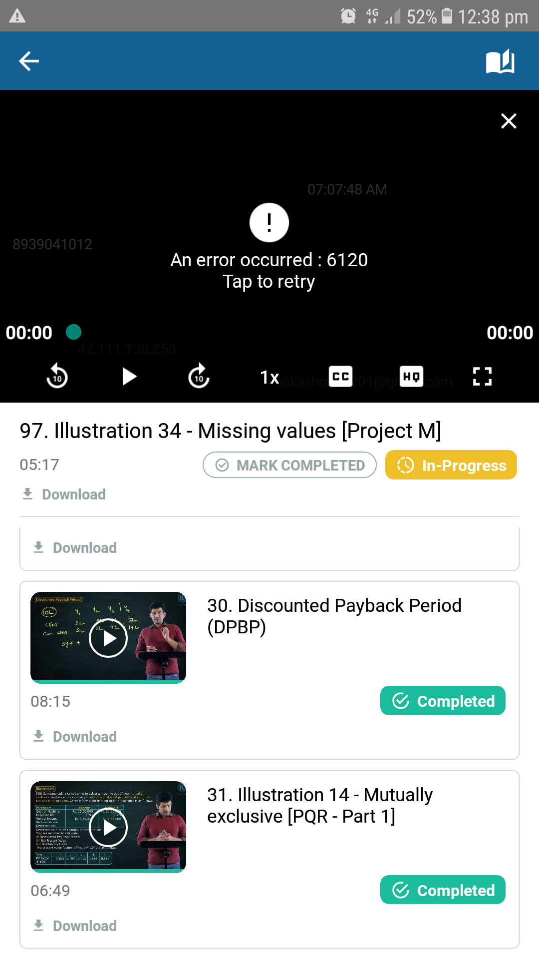We are able to play on our mobiles / laptops. Error 6120 is a temporary network error, should work on retry. Try playing the videos with stable internet connectivity and it should work seamlessly. If you are still facing the issue, please send an email to support@indigolearn.com with following details: 1. Screenshot of the error 2. Visit https://www.whatismyip.com/ in your phone browser and share a screenshot of it. 3. Are you facing this issue for all videos or some videos? 4. Has it started recently and you were able to access earlier?