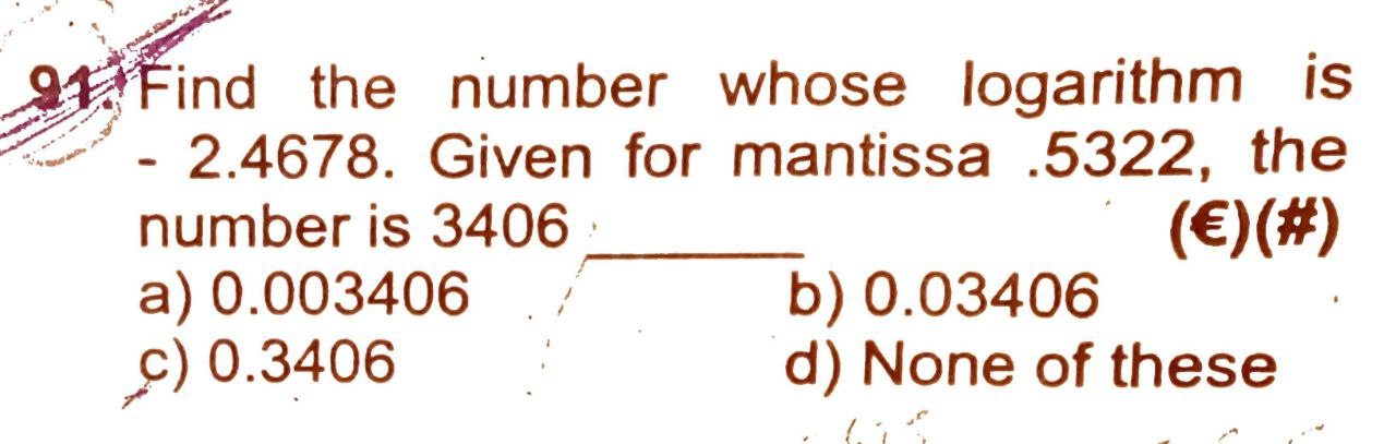 Let log N = â??2.4678 = â??2 â??1 + 1 â?? 0.4678 = â?? 3 + .5322 As given, for mantissa 0.5322, the number is 3406 The characteristic is â??3, therefore the number is less than one and there must be two zeros just after the decimal point. Hence, antilog â??2.4678 = 0.003406