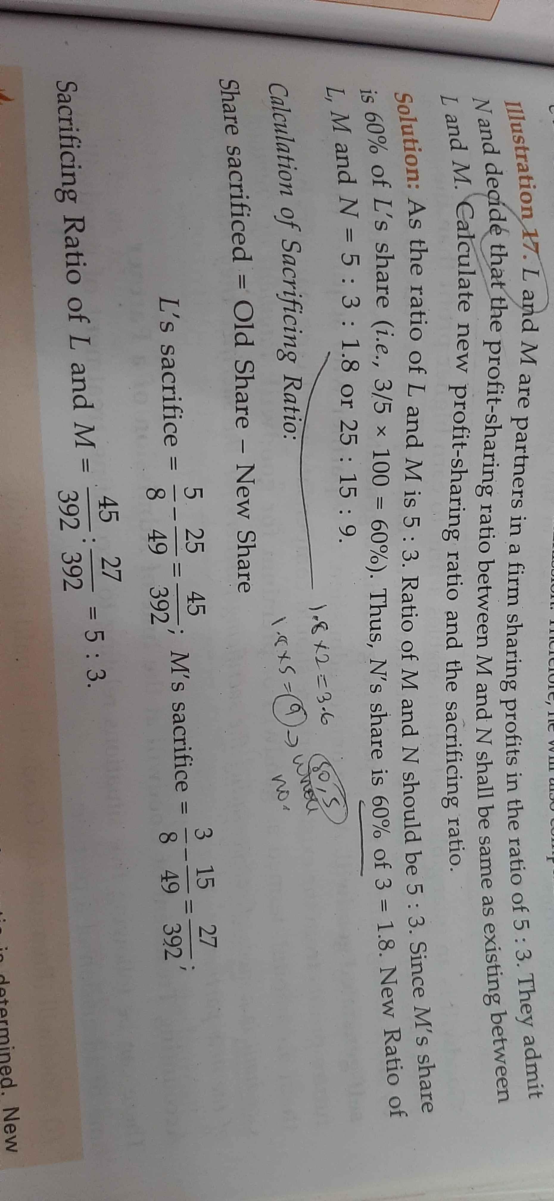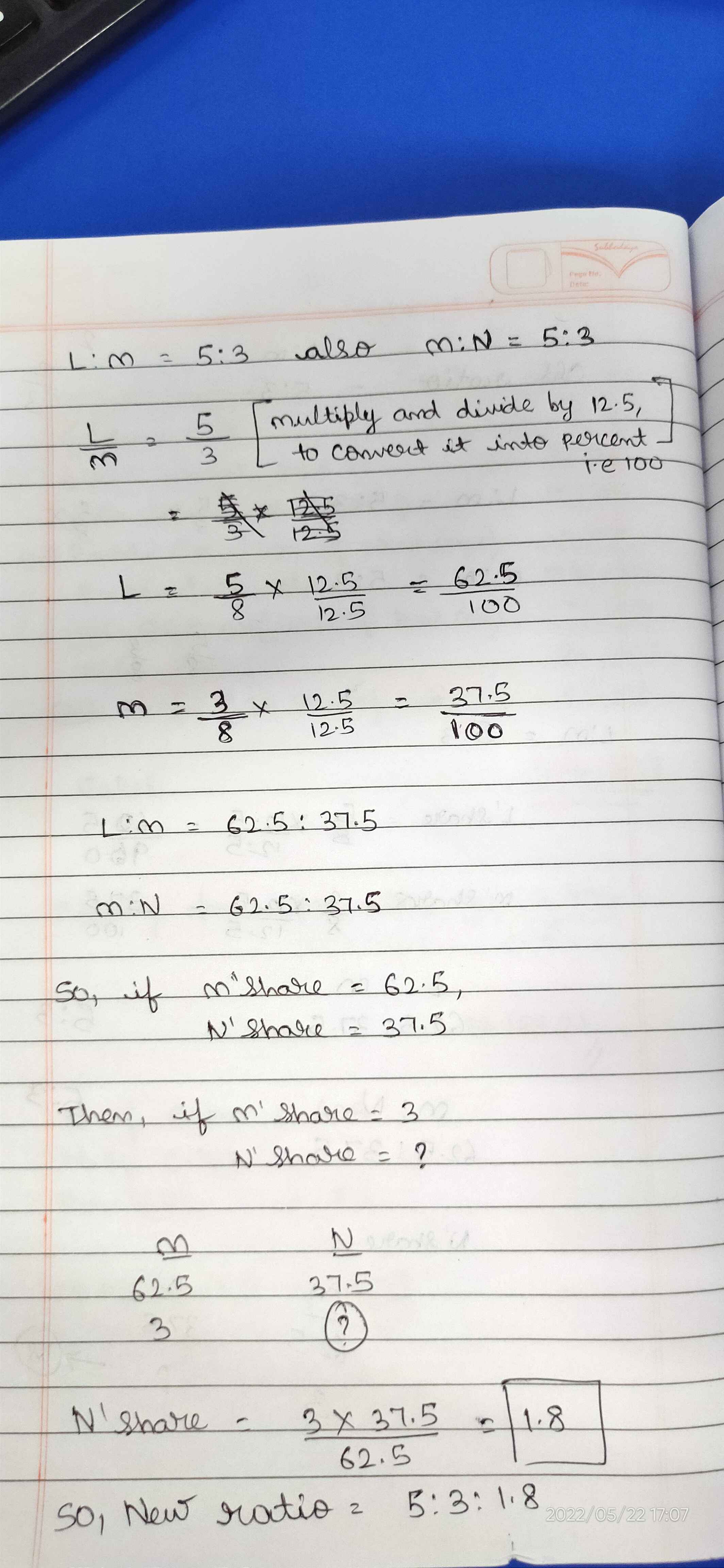 L:M = 5:3 M's share is 60%(3/5*100) of L So N share should be 60% of M N' Share = 3*60/100 = 1.8 NPSR = 5:3:1.8 Multiply by 5 in order to rounded off NPSR = 25:5:9