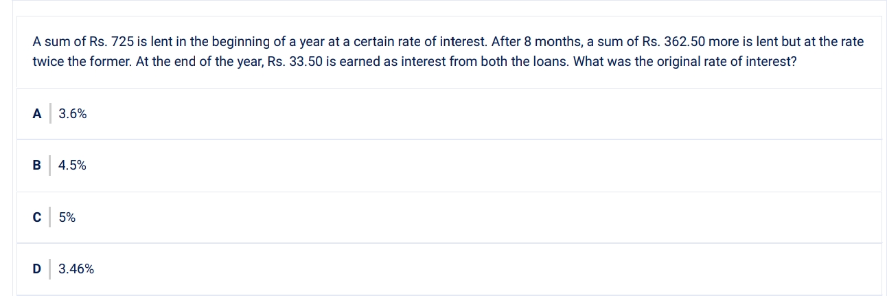 This can be done by assuming interest rate as x and solving or take a number from the options preferrbaly between 3.46 and 3.6 i.e 3.5% and substituting and solving for it If we assume x as interest rate then 725 * x%* 12/12 + 362.50 *2x*4/12 = 33.50 725x% + 724x%/3 = 33.50 2175x% +725x%=100.5 2900x% = 100.5 x% = 100.5/2900 x% = 3.4655%